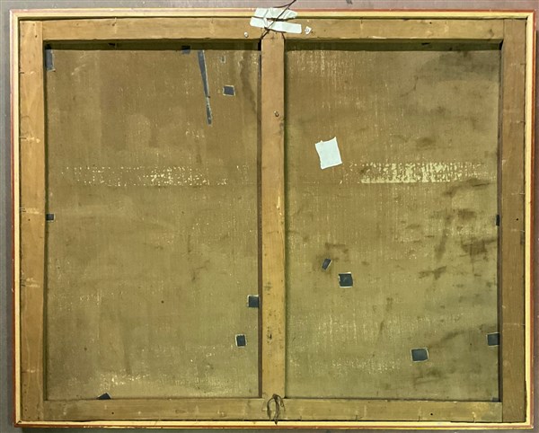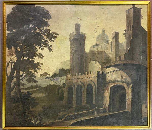 Ignoto, antico dipinto raffigurante capriccio architettonico con figura, olio s
