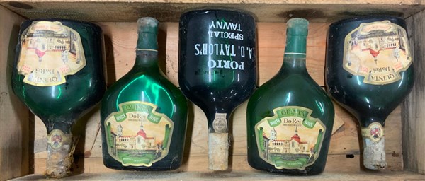 Scatola in legno contenente cinque bottiglie di Porto (difetti alle bottiglie,