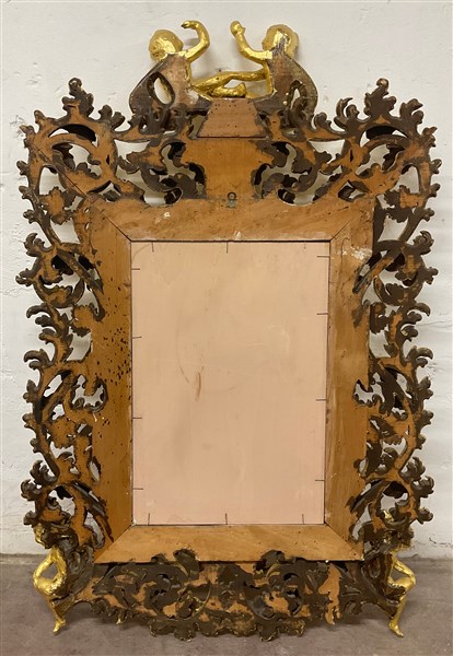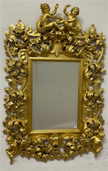 Specchiera in legno intagliato e dorato con decoro a volute fogliacee a cartoccio e putti alla base e alla sommità (cm 92x137) (difetti)