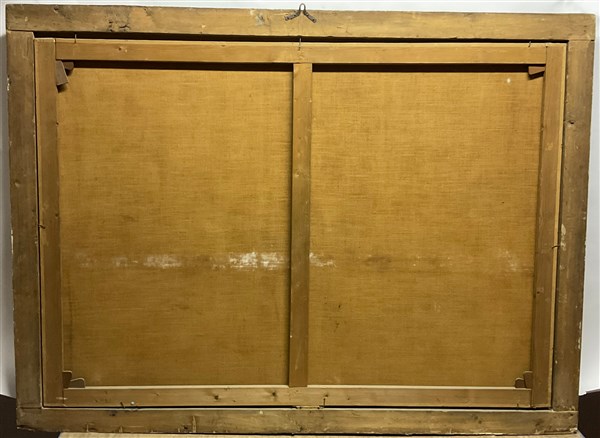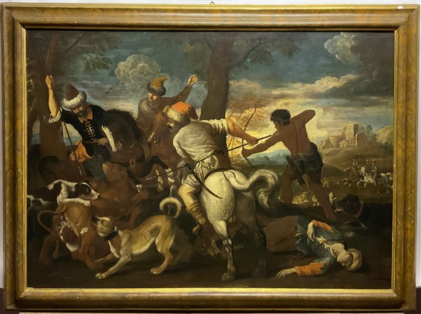 Scuola del XVIII secolo, Caccia al leone, olio su tela (cm 125x175), in cornice del XVIII secolo laccata in epoca posteriore e dipinta a finto marmo