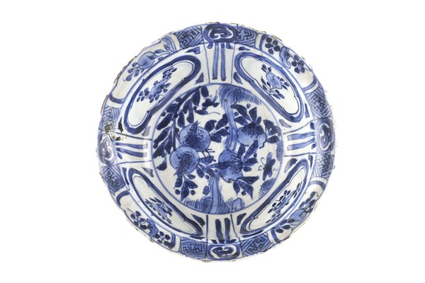 Ciotola in porcellana bianca e blu Kraak, il fondo e i bordi interni dipinti con frutti (difetti)