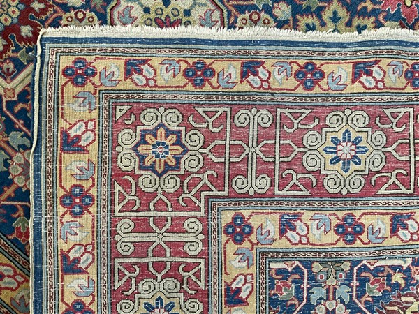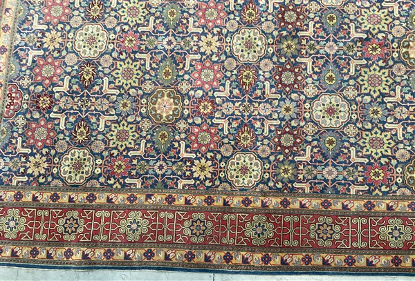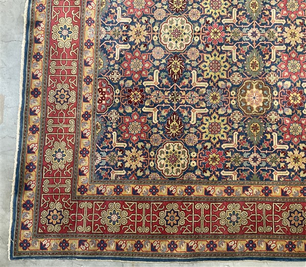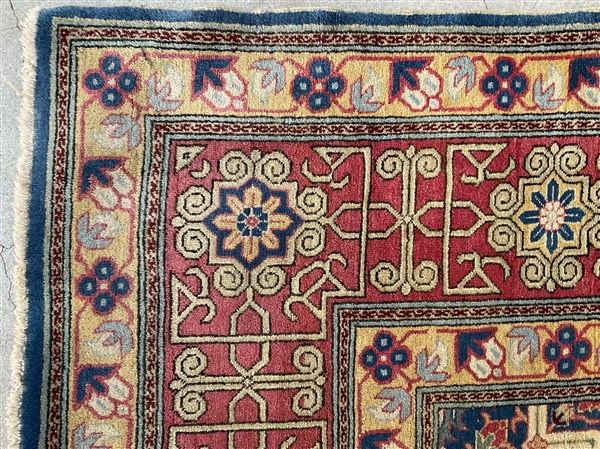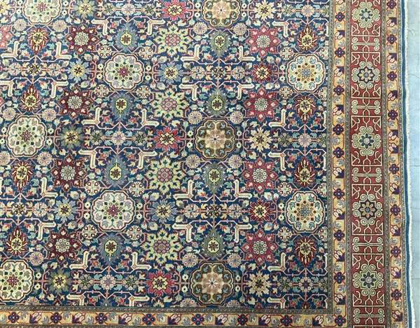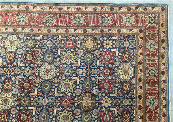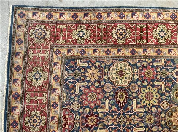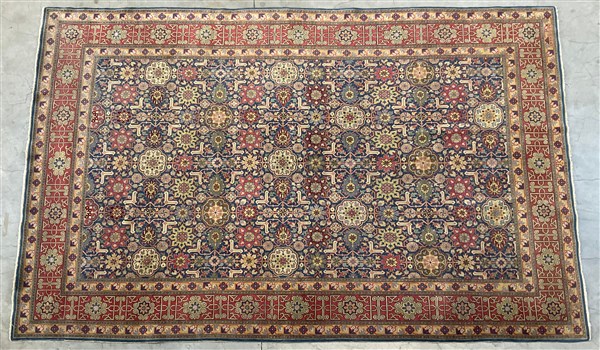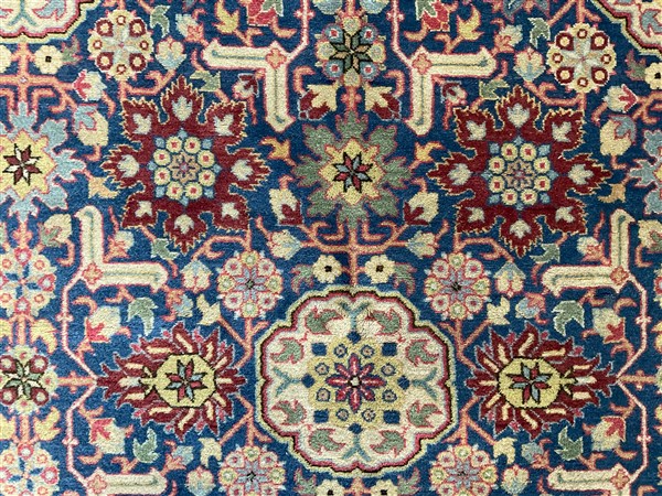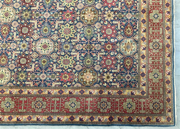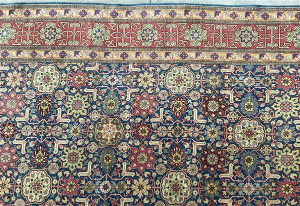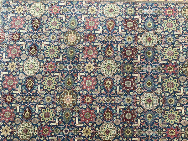 Tappeto Caucasico di moderna manifattura, decoro all over geometrico policromo su fondo blu notte (cm 307x207) (difetti)