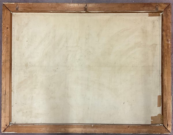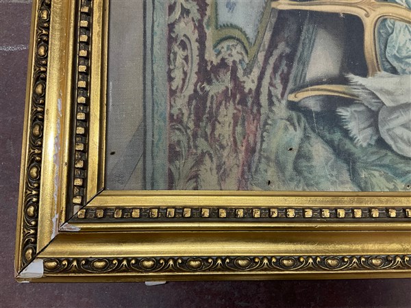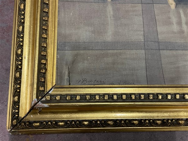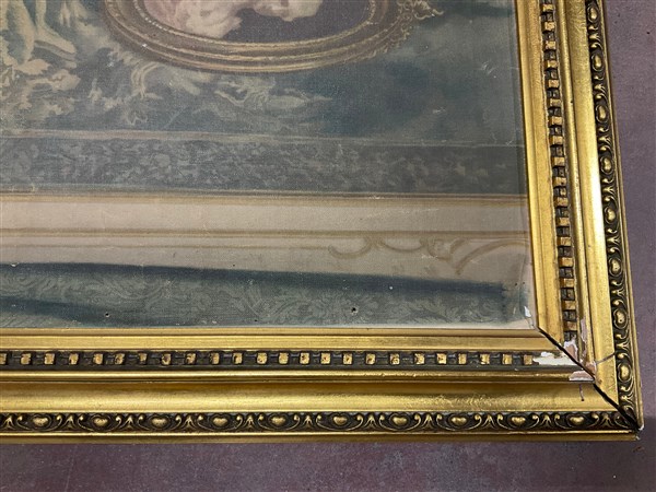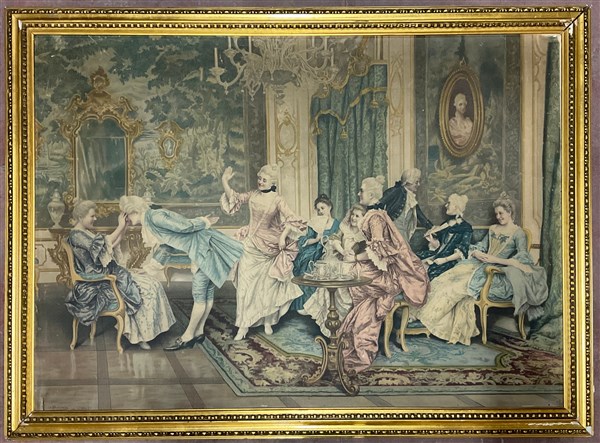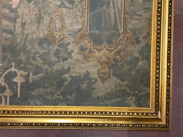 Manifattura della fine del secolo XIX. Arazzo succo d'erba raffigurante scena galante, firmato in basso a sinistra (cm 120x150) In cornice (difetti)