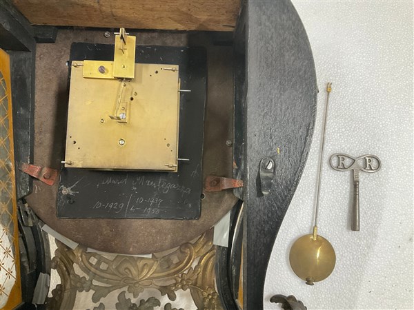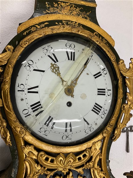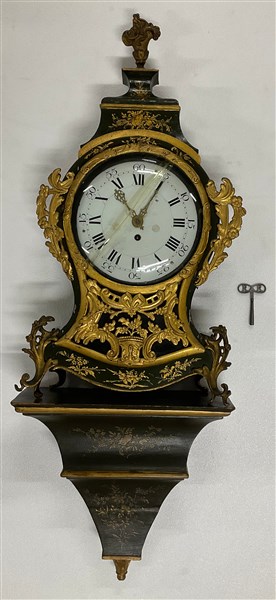 Pendola del tipo Neuchatelois cartel con mensola e cassa in legno dipinto e dorato, quadrante in smalto bianco a numeri romani per le ore, arabi per i minuti. Fregi in metallo dorato. Secolo XIX (h. tot. cm 108) (difetti, restauri e sostituzioni)