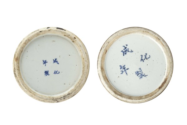 Coppia di vasi a tromba in porcellana bianca e blu decorati con simboli Shuangx