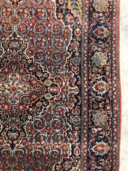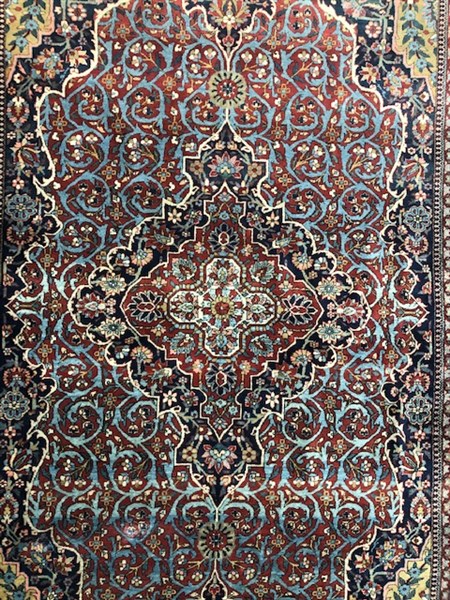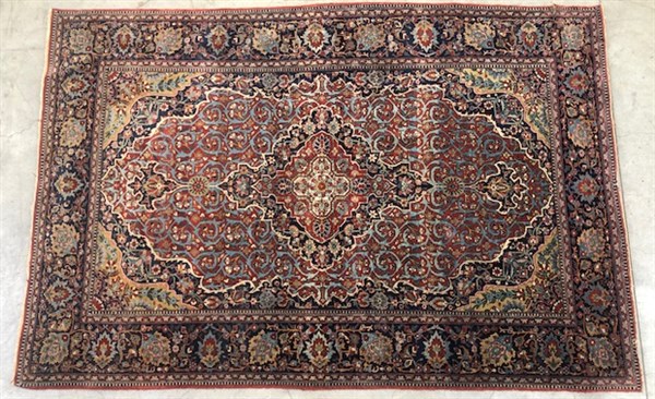 Tappeto Keshan, Persia, secolo XX. Decoro con medaglione lanceolato con puntali a campo rosso e blu su campo rosso cosparso di rami fioriti e azzurri (cm 204x137) (difetti, rotture, un taglio)