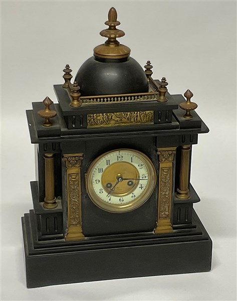 Tainsh, Paris. Orologio di forma architettonica in marmo nero con inserti in bronzo a soggetto mitologico. Quadrante a fascia a numeri arabi, movimento a due treni con suoneria delle ore e mezze su gong. Seconda metà del secolo XIX (h cm 48) (difetti)