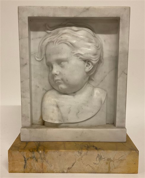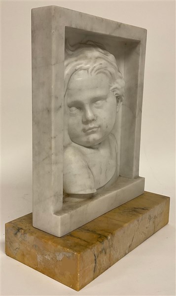 Ignoto scultore di inizio XX secolo, bassorilievo in marmo bianco raffigurante "Mezzobusto di bambino" poggiante su base in marmo giallo (h. cm 35)