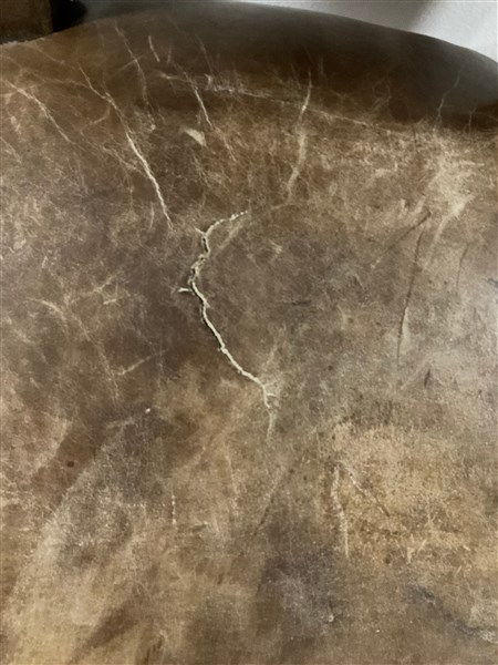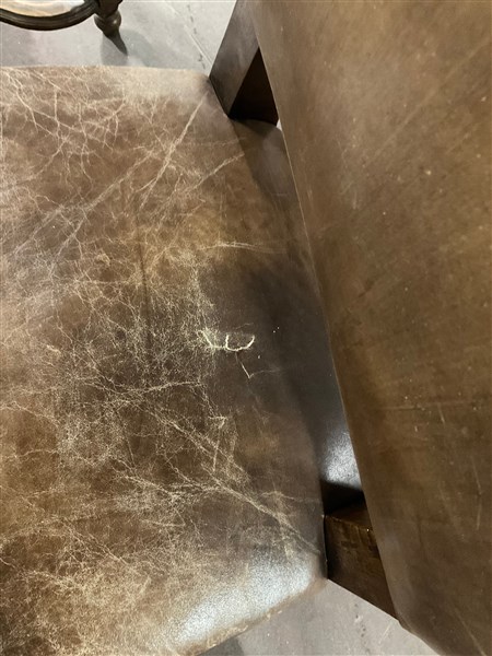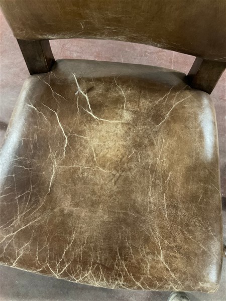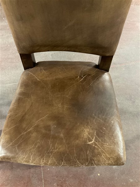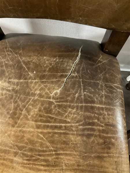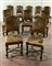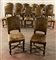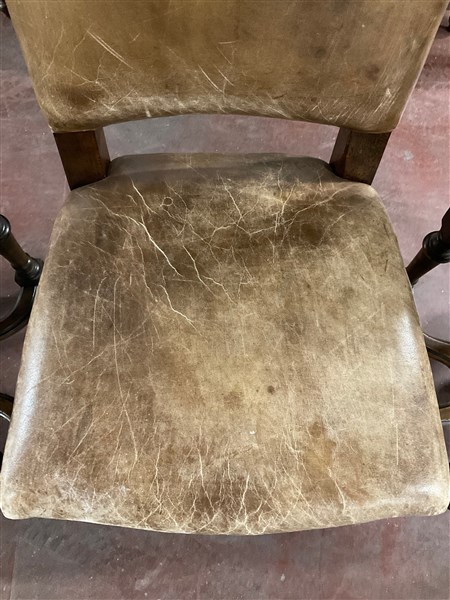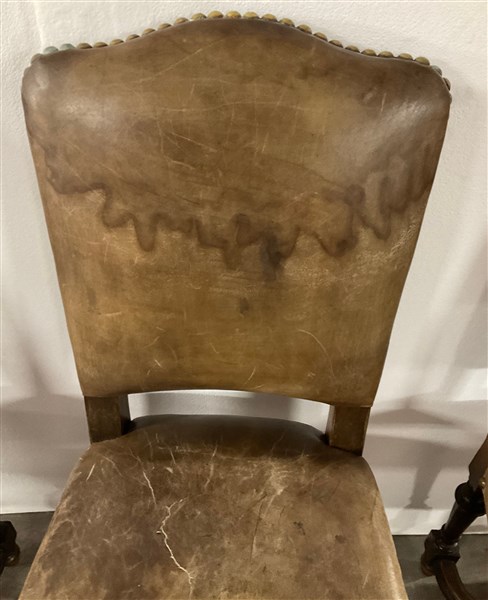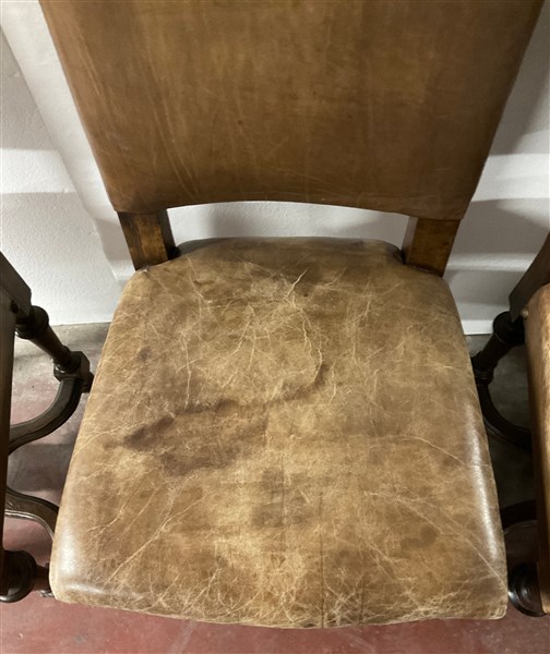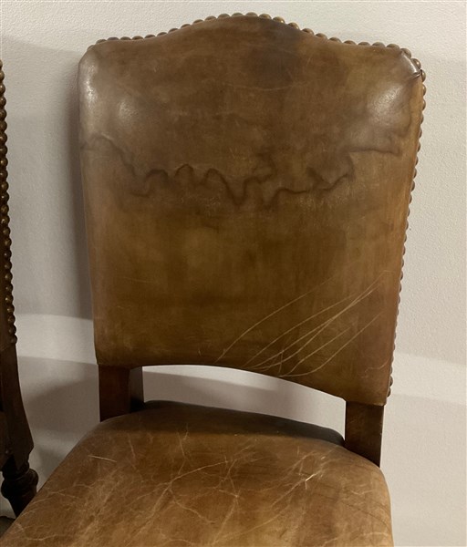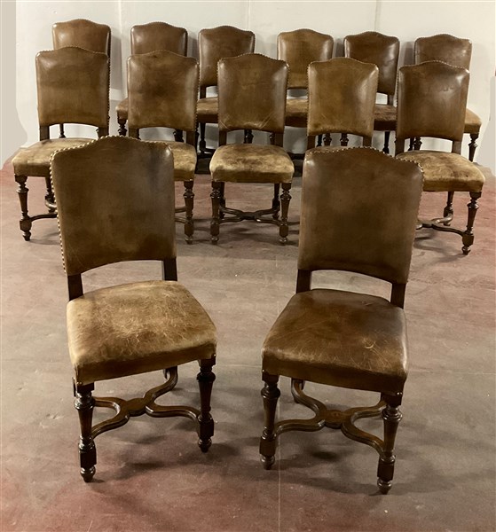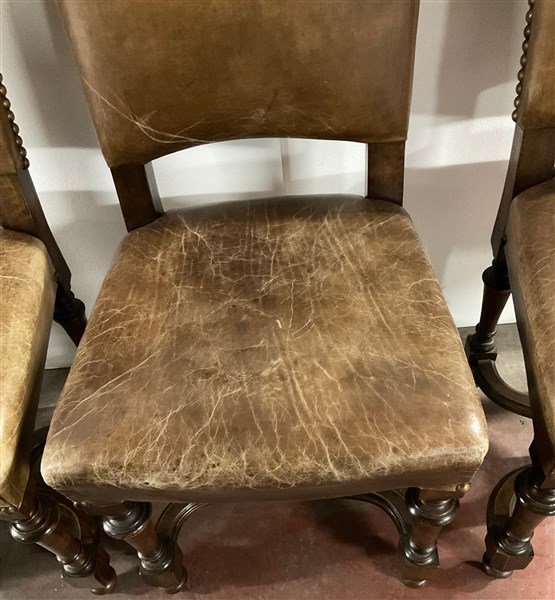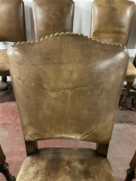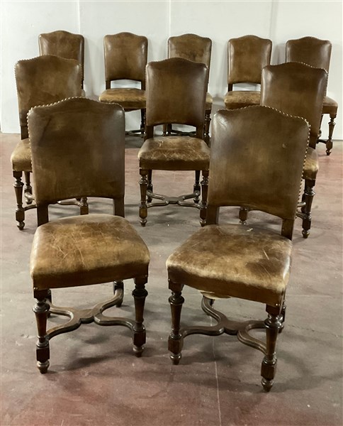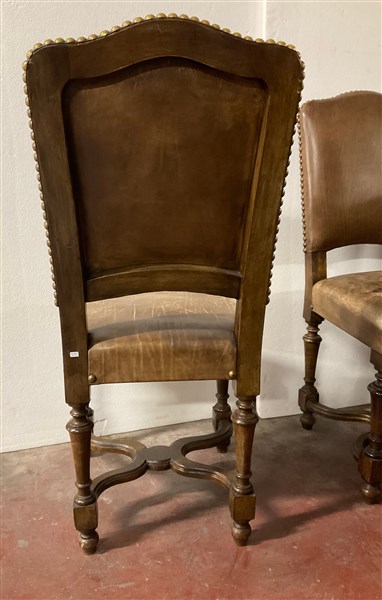 Gruppo di ventitre sedie in legno, gambe a rocchetto riunite da traversa sagomata. Seduta e schienale rivestiti in pelle borchiata (difetti)