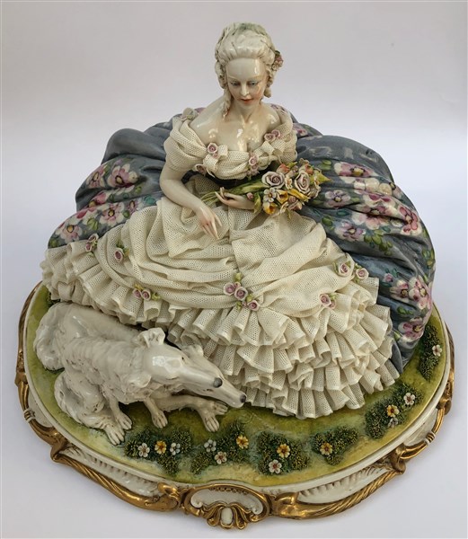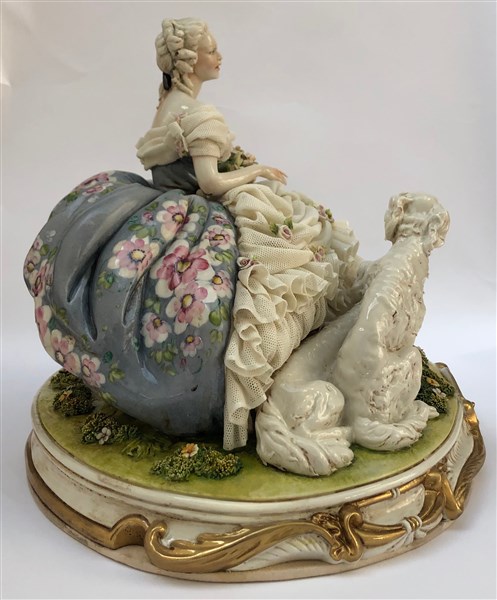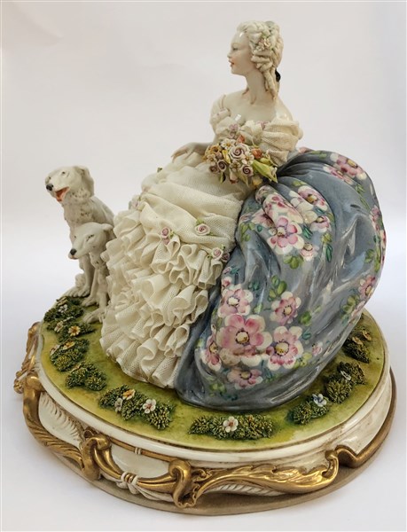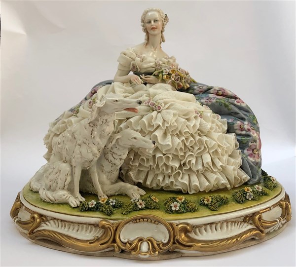 Manifattura di Capodimonte, gruppo in porcellana dipinta in policromia raffigurante dama con levrieri (cm 40x29) (difetti)