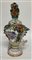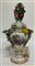 Manifattura tedesca, secolo XIX - XX. Vaso con coperchio in porcellana dipinta in policromia decorato da fiori e putti a rilievo e scene galanti a fiori entro riserva, profili in oro. Marcato alla base (cm 25x44) (difetti)