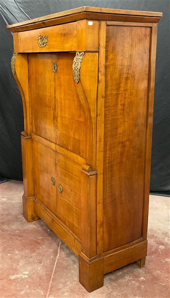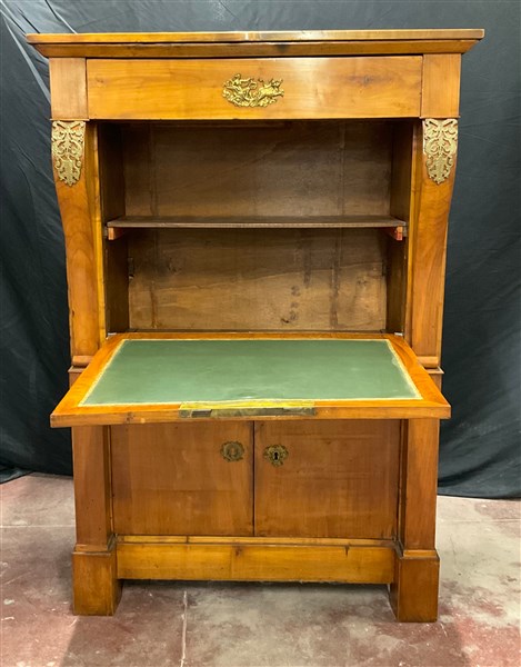 Secretaire in legno con applicazioni in metallo dorato. Fronte a un cassetto sottopiano, calatoia celante mensole con piano in pelle verde con bordo impresso in oro e due ante. Montanti mossi nella parte superiore, a pilastro in quella inferiore. Secolo XIX (cm 101x146x46) (difetti e restauri)