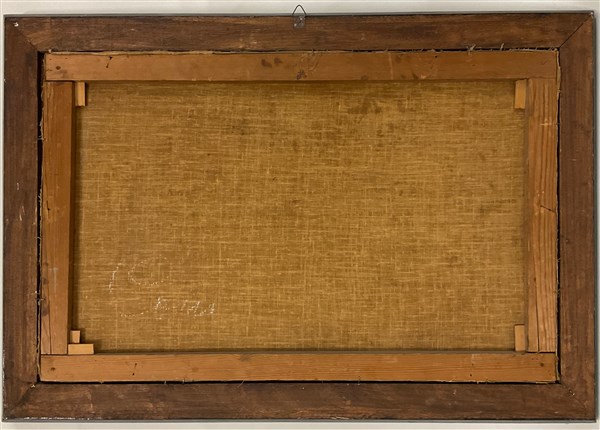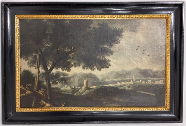 Ignoto, antico dipinto ad olio su tela raffigurante paesaggio con città turrita sullo sfondo (cm 51,5x83) in cornice in legno ebanizzato e dorato (lievi difetti)