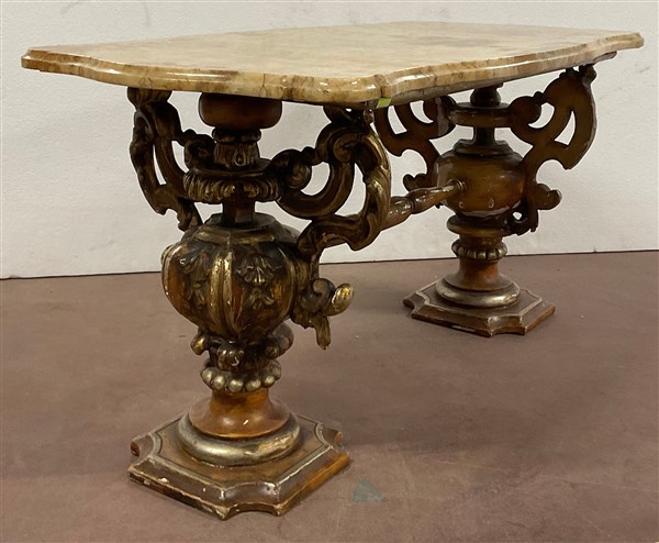 Tavolo da salotto in legno intagliato, laccato e dorato. Montanti a finti vasi biansati riuniti da traversa a rocchetto. Piano sagomato in marmo, secolo XX (cm 85x45x44,5) (difetti)