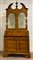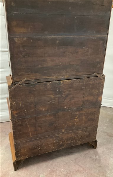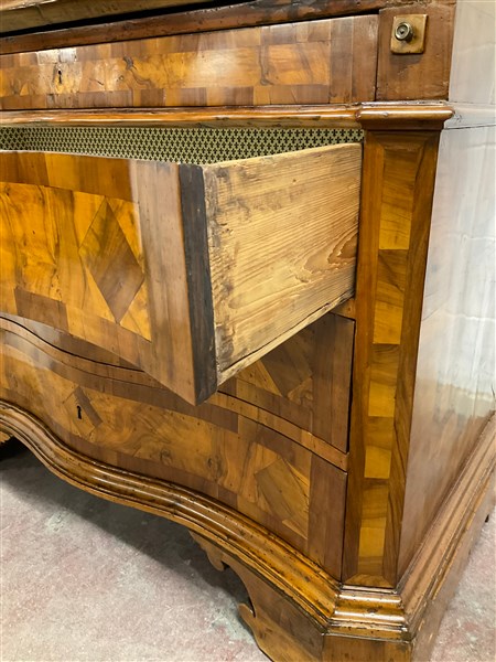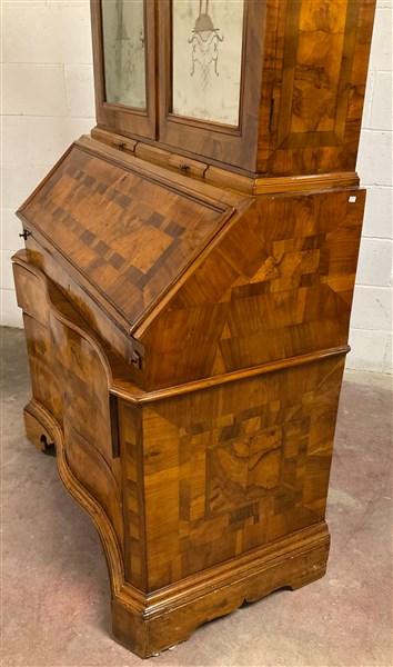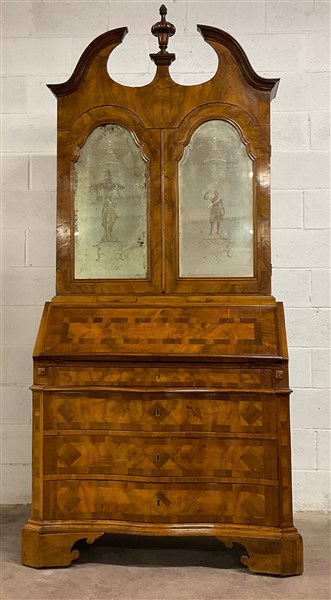 Antico trumeau lastronato e filettato in legni vari, parte superiore di struttura architettonica a due ante a specchio decorate a figure classiche, parte inferiore con fronte mosso a tre cassetti sotto uno a mezza altezza, anta ribaltabile celante cassettini, piedi a mensola (cm 106x240x60) (difetti e restauri)