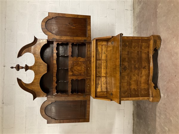 Lotto 1169 | Antico trumeau lastronato e filettato in legni vari, parte superiore di struttu