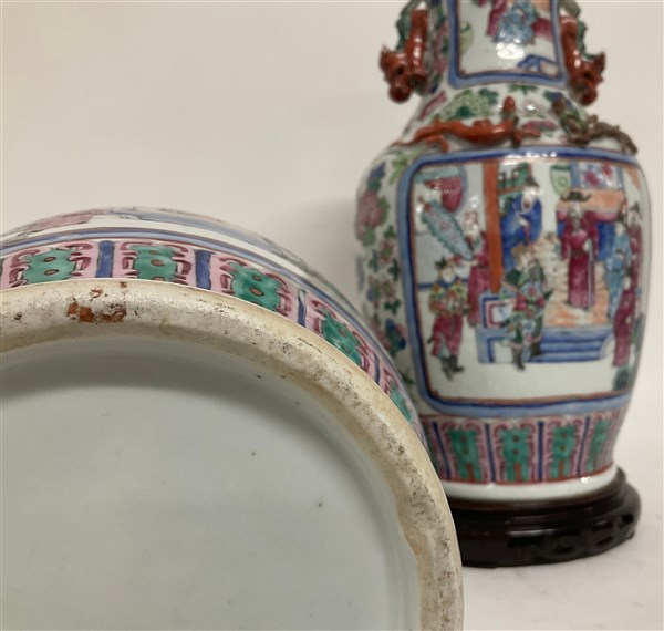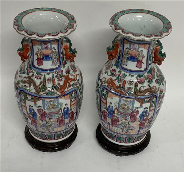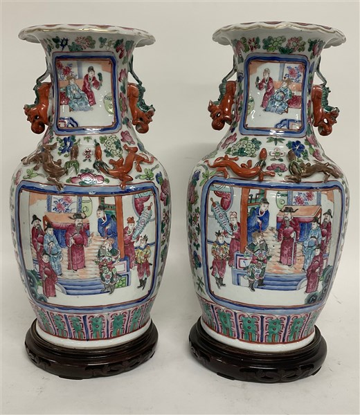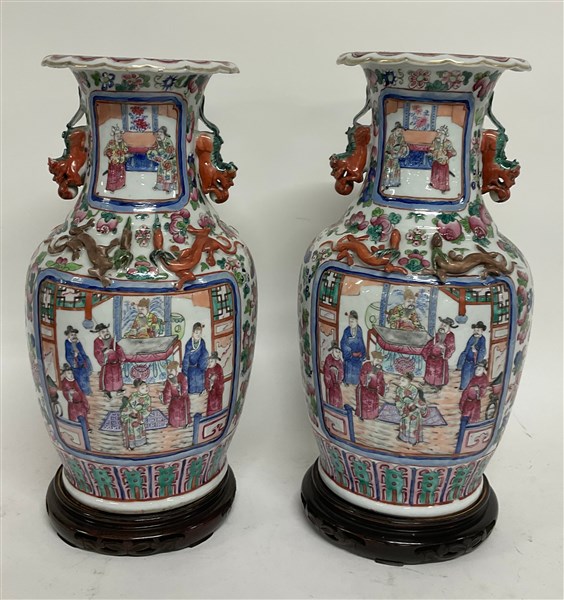 Coppia di vasi in porcellana Famiglia Rosa con decoro policromo a figure, basi in legno