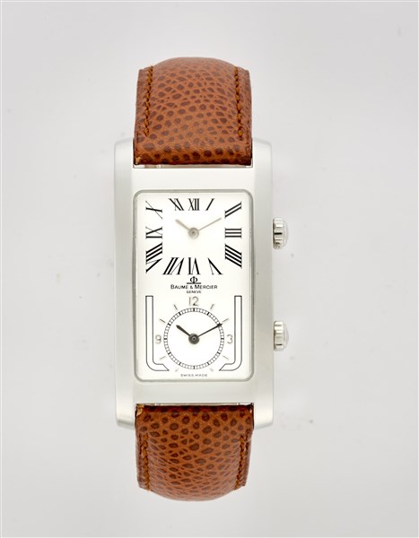 Baume & Mercier, Hampton Ref. MV045121. Orologio da polso da donna in acciaio. Anni 2000. Quadrante, movimento e cassa firmati. Movimento al quarzo. Quadrante bianco, doppio quadrante con numeri romani stampati e numeri arabi applicati. Cassa n. 3002566. Cal. ETA 976.001. Misure mm 45x25. senza scatola e garanzia. (lievi difetti)