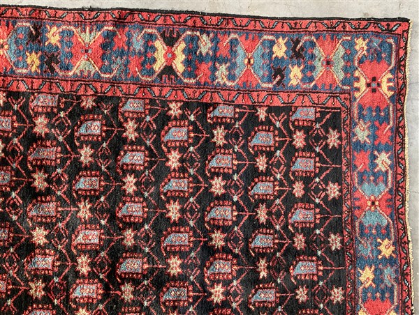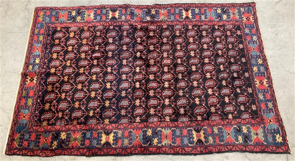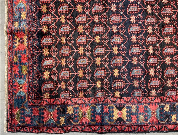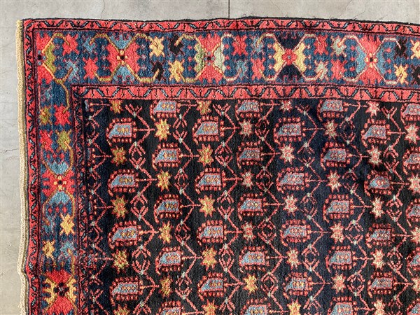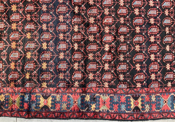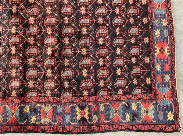 Tappeto Heritz, Persia, secolo XX. Decoro all over con Boteh azzurri su fondo blu notte. Bordure a granchi su fondo azzurro (cm 198x130) (difetti)