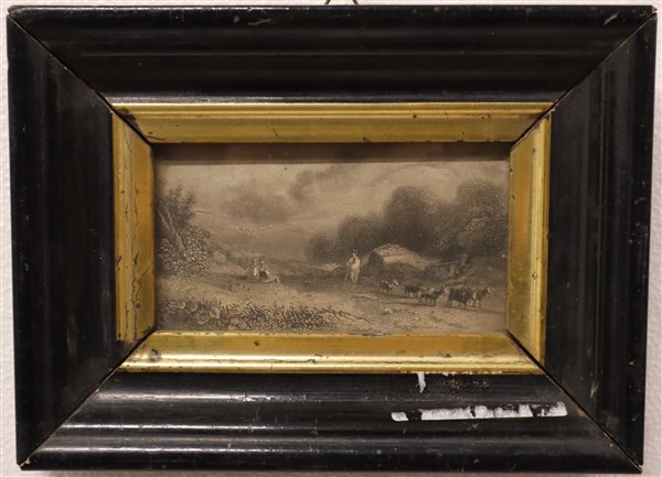 Lotto composto da una lastra per incisioni in rame ed una piccola incisione raffigurante paesaggio bucolico, in cornici (difetti)