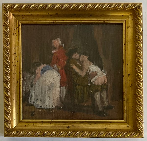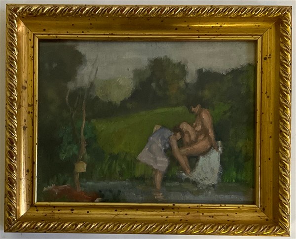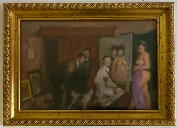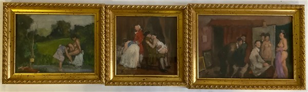 Firma indecifrata "Colleghi di provincia in studio", "Ragazze al bagno", "Il lupanare, lotto composto da tre oli su tela di misure diverse (misura max cm 19x29) due siglati in basso a destra, tutti titolati a matita al retro e uno firmato
