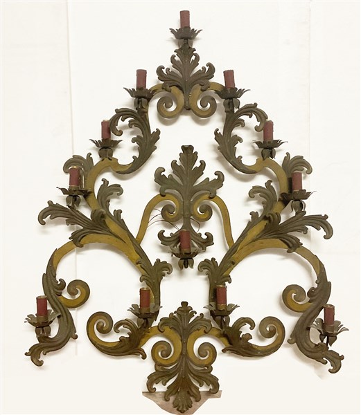 Grande applique a dodici luci in ferro e lamierino in parte dipinto, a volute f