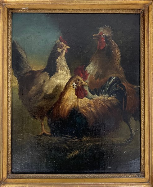 Ignoto, antico dipinto ad olio su tela raffigurante galli e gallina (cm 47,5x38,5) in cornice (difetti)