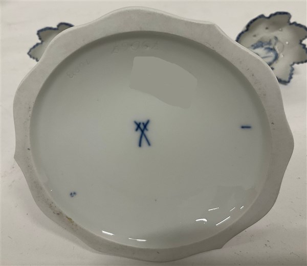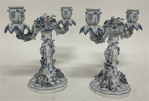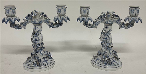 Manifattura di Meissen, coppia di candelieri a due fiamme in porcellana bianca dipinta in monocromia blu con decoro a "fiore di cipolla". Marcati alla base con numerale incusso (cm 24x24) (lievi difetti)