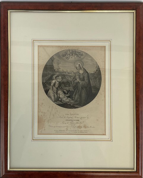 Incisione del XIX secolo da un'invenzione del XVI secolo raffigurante Natività, bulino (mm 275x210) in cornice (difetti)