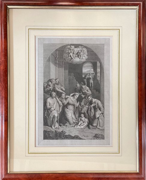 Incisione del XIX secolo da un'invenzione del XVI secolo raffigurante Adorazione del Bambino, bulino (mm 320x220) in cornice (lievi difetti)