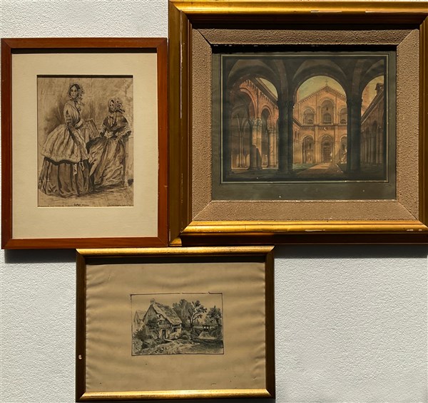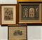 Lotto composto da due acquaforti su tessuto, di cui una edita da Mengaldi a Milano, ed un'incisione a colori di F. Fumagalli raffigurante il chiostro della Basilica di S. Ambrogio a Milano, misure diverse, in cornici (difetti)