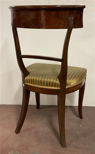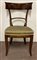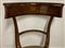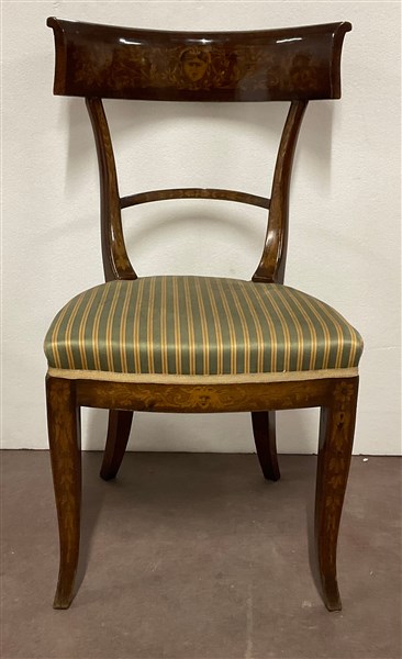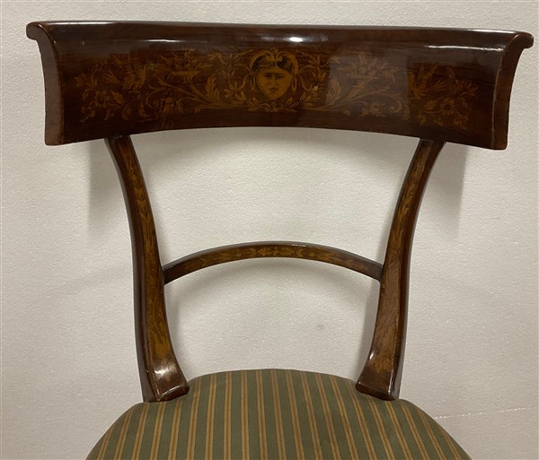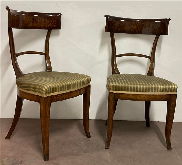Coppia di sedie in di forma mossa in legno intarsiato e pirografato a volute fogliate, fiori, volatili e mascheroni. Schienale a giorno e seduta imbottita, secolo XIX (difetti)