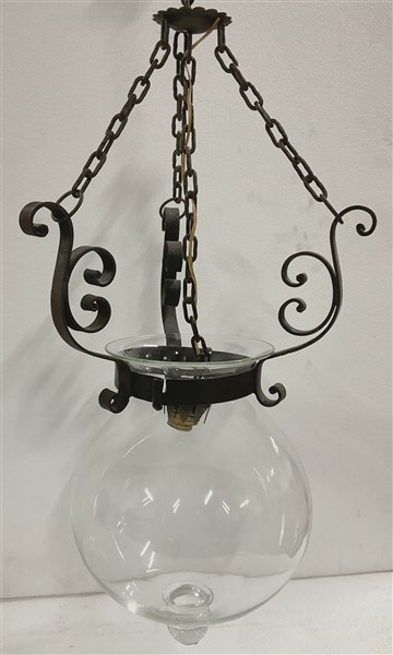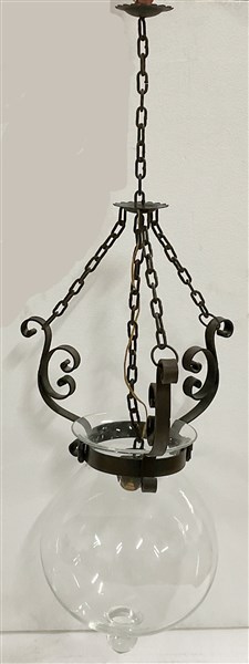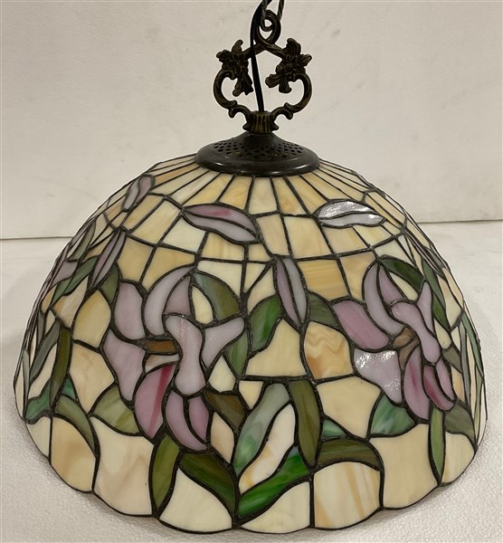 Lotto composto da un lampadario in vetro policromo piombato (h. cm 97) e un lampadario in ferro battuto decorato a riccioli con paralume in vetro (h. cm 70 ca.) (difetti)