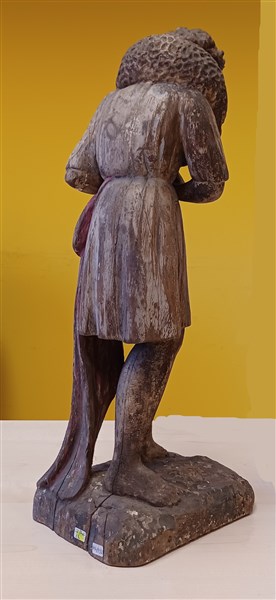 Scultura lignea raffigurante un pastore con pecora sulle spalle, tracce di policromia (h. cm 57)