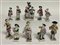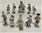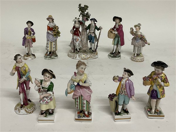 Manifatture differenti. Lotto di dieci diverse figure in porcellana policroma con profili in oro. Secoli XIX/XX (h. max 19,5) (difetti)