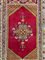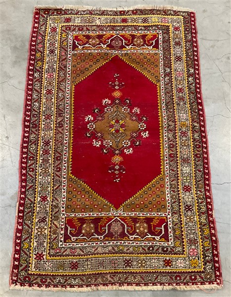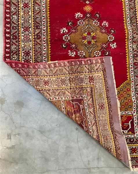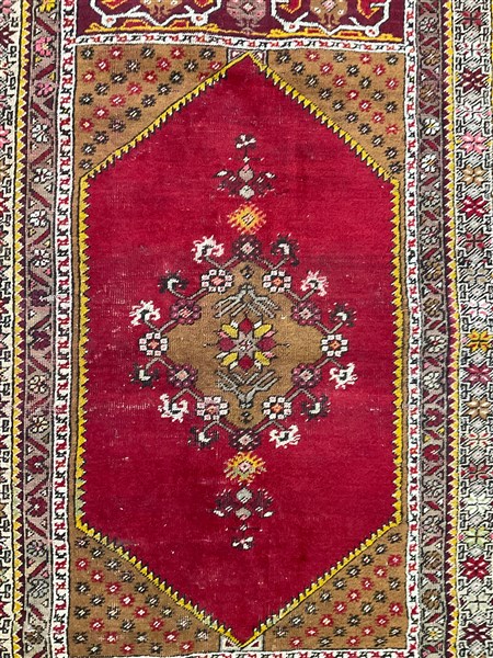 Tappeto Mudjur, Anatolia, inizio secolo XX. Decoro con medaglione romboidale fiorito su campo color rubino tinta unita. Due cartigli alle estremità e numerose bordure (cm 160x101) (difetti)