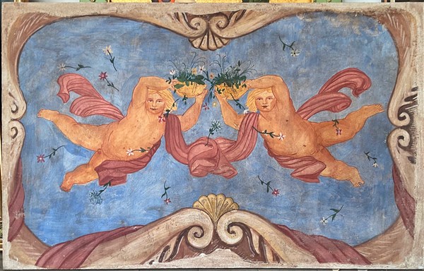 Lotto composto da una stampa su compensato raffigurante tucano (cm 69x114), un dipinto a tecnica mista su tela moderno riproducente stacco di affresco con putti (cm 90x140) e una riproduzione di un dipinto antico (cm 89x119). Due in cornici (difetti)