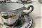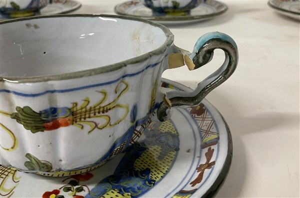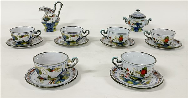 Manifattura Zoli, Faenza. Parte di servizio da tè in ceramica composto da sei tazze con piatto, zuccheriera con coperchio e lattiera. Decoro policromo al garofano, marcato alla base (difetti e mancanze)