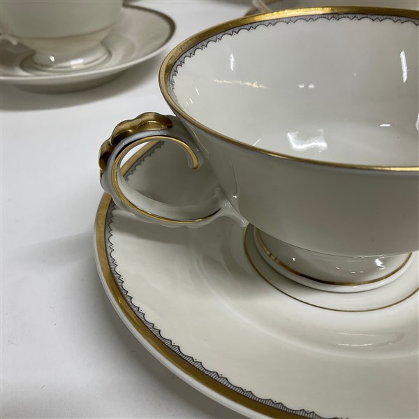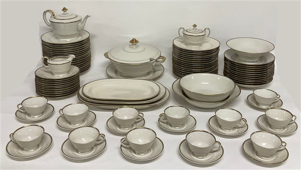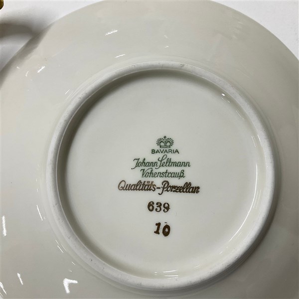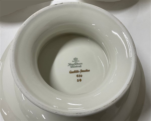 Manifattura Bavaria, secolo XX. Parte di servizio da tavola composto da trentacinque piatti piani, dodici piatti fondi, undici piatti da dessert, sei piatti da portata, dodici tazze da tè con piattini, zuppiera, zuccheriera, lattiera, teiera (difetti)