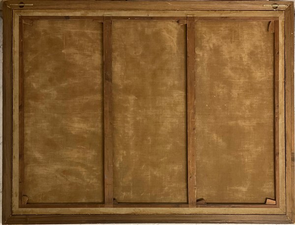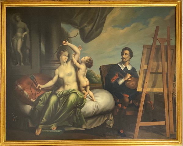 Ignoto francese della prima metà del XIX secolo, "Venere e Cupido in posa per il pittore" olio su tela (cm 172x230) Reca iscrizione non coeva "Court 1828" in basso a destra. In cornice (difetti)