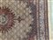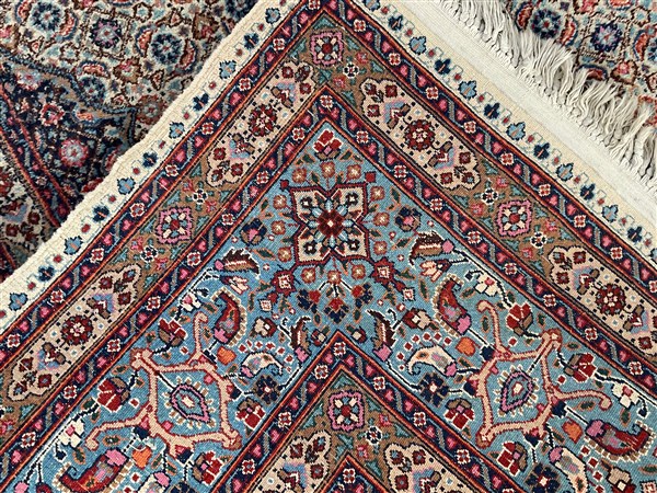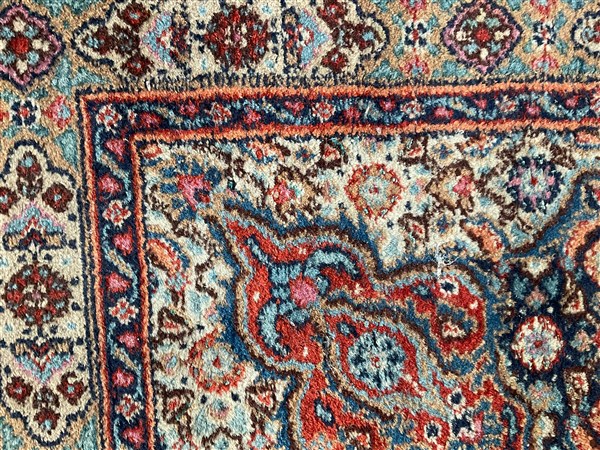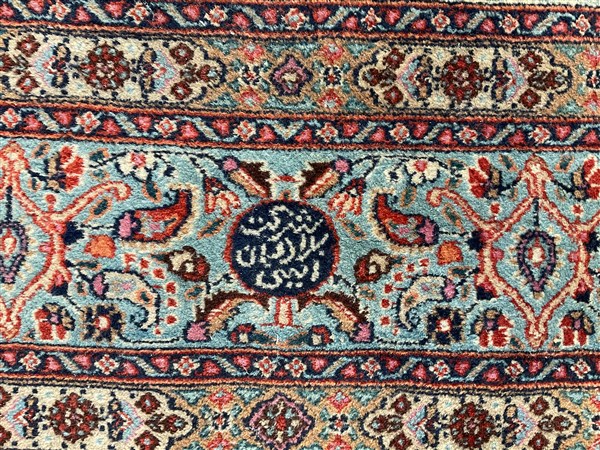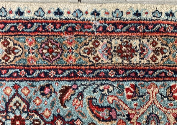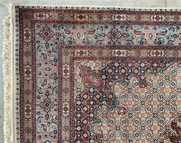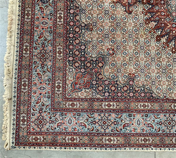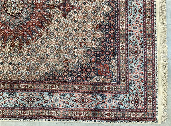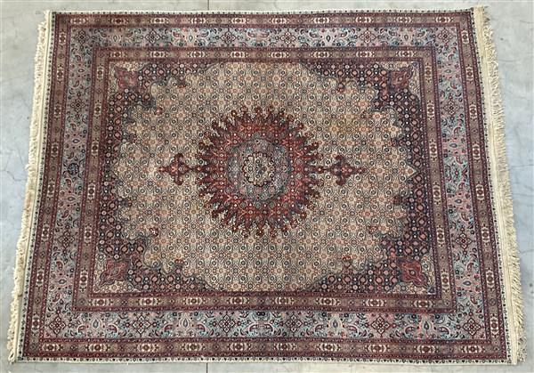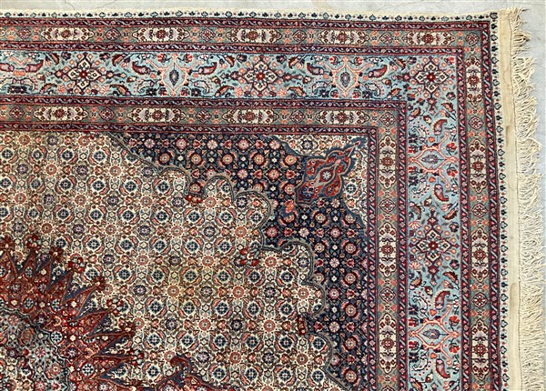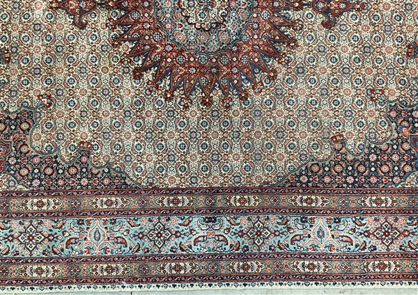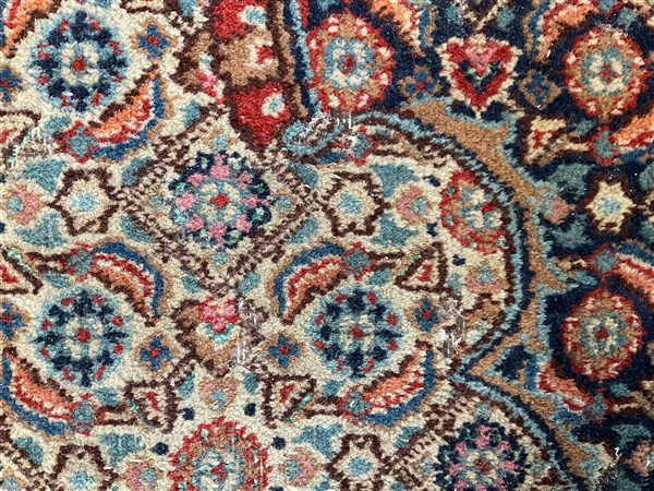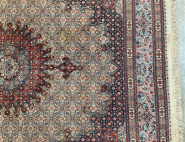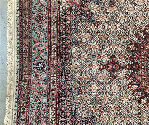 Tappeto Keshan, Persia, secolo XX. Decoro con medaglione stellato su campo bianco ornato da motivo Herati. Recante ad una testata un cartiglio circolare con iscrizione in persiano (cm 249x197) (lievi difetti)