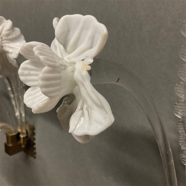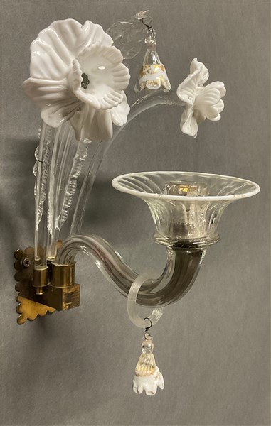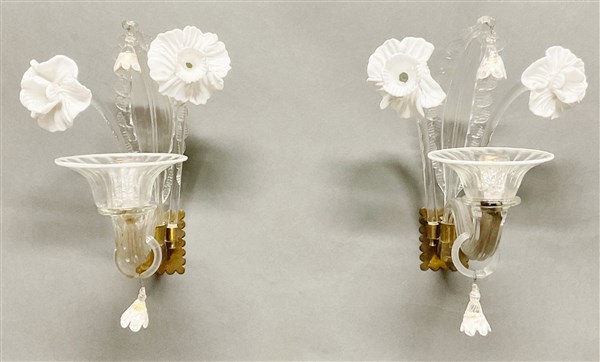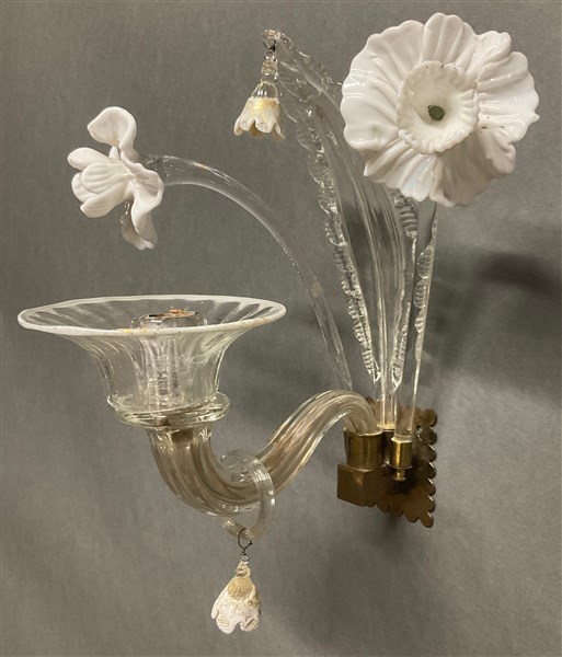 Manifattura di Murano. Coppia di applique in vetro soffiato ad una fiamma con decori a foglie e fiori (h cm 27) (difetti)
