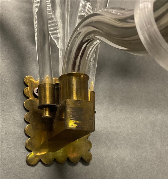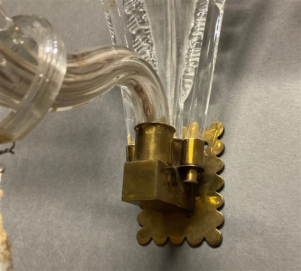 Manifattura di Murano. Coppia di applique in vetro soffiato ad una fiamma con d
