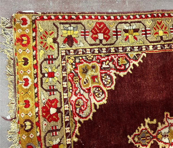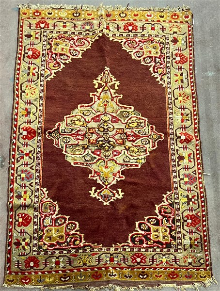 Tappeto Ghiordes, Anatolia, fine secolo XIX. Decoro con medaglione floreale su fondo color tabacco. Elegante bordura a meandro su fondo verde chiaro (cm 177x114) (difetti e rapature)