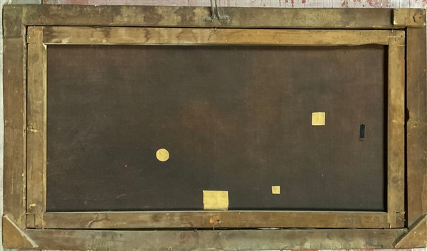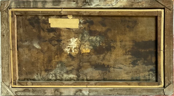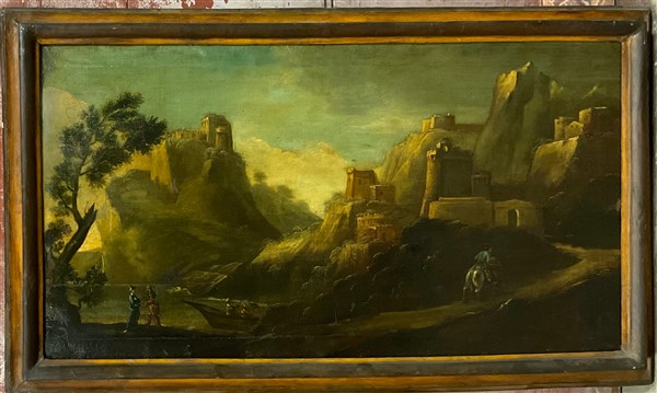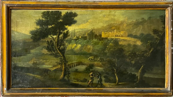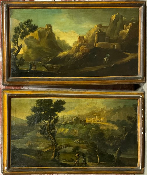 Ignoto, coppia di antichi dipinti raffiguranti figure in paesaggi, olio su tela (cm 64x114), in cornice