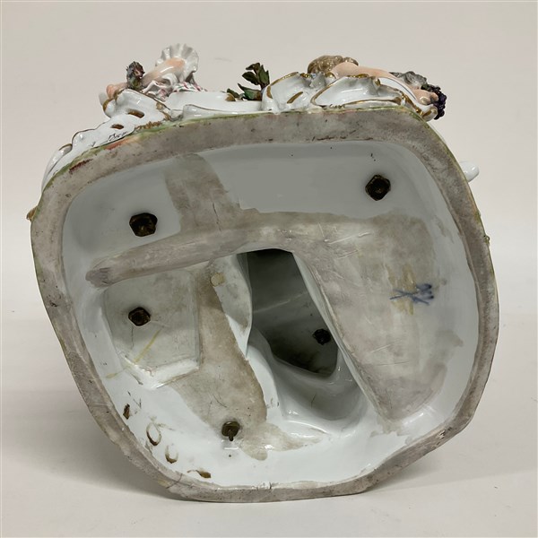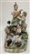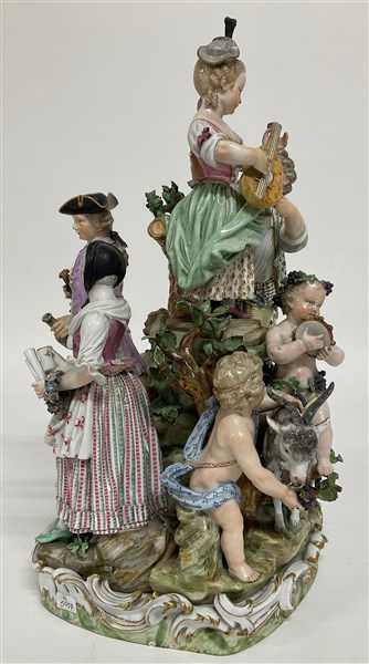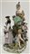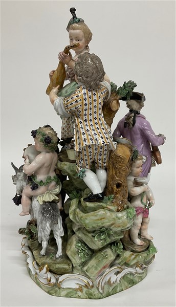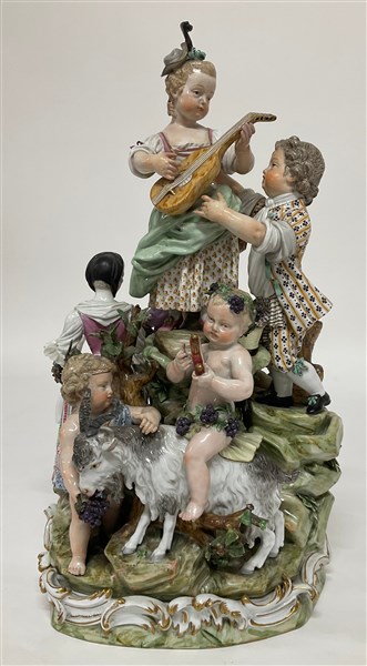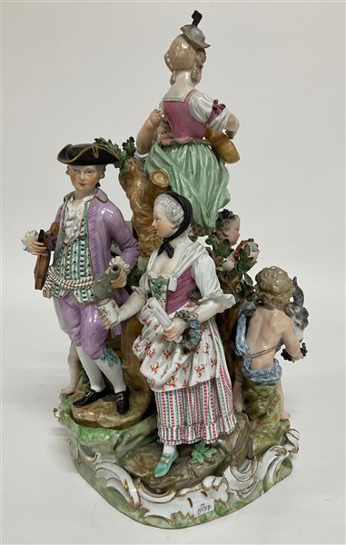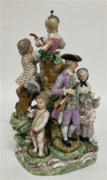 Manifattura tedesca, secolo XIX. Gruppo in porcellana dipinta in policromia con figure musicanti e animali (h. cm 37) (difetti e rotture)