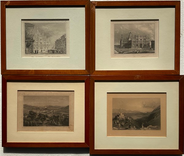Lotto di otto incisioni monocrome raffiguranti paesaggi e monumenti (cm 25x30) in cornici (difetti)