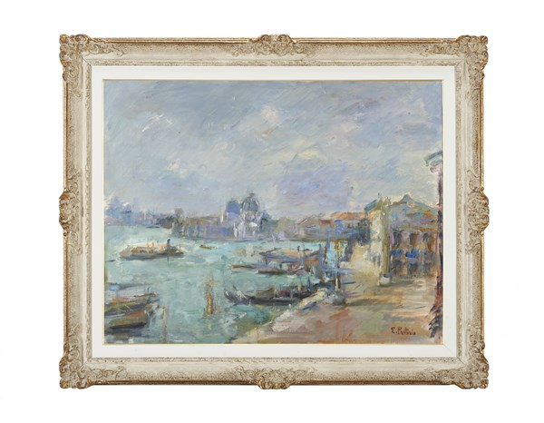 "Venezia, Bacino di San Marco" olio su tela (cm 70x90) Firmato in basso a destra. Al retro: cartiglio e timbri. In cornice
