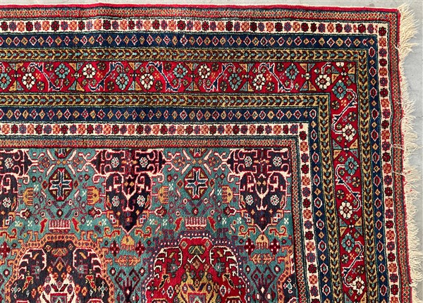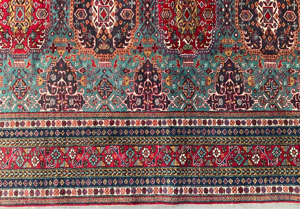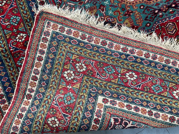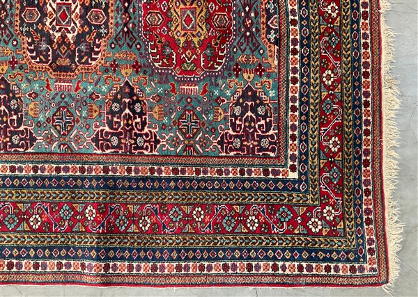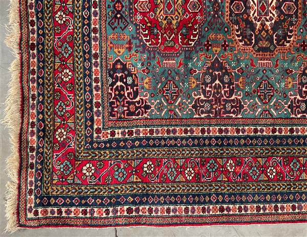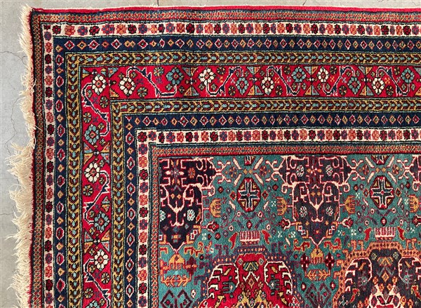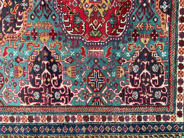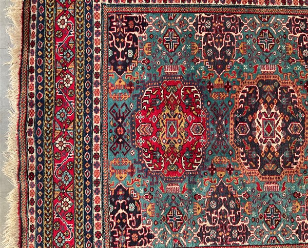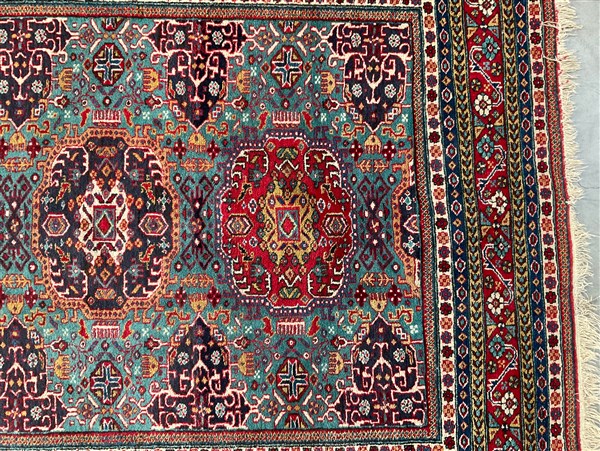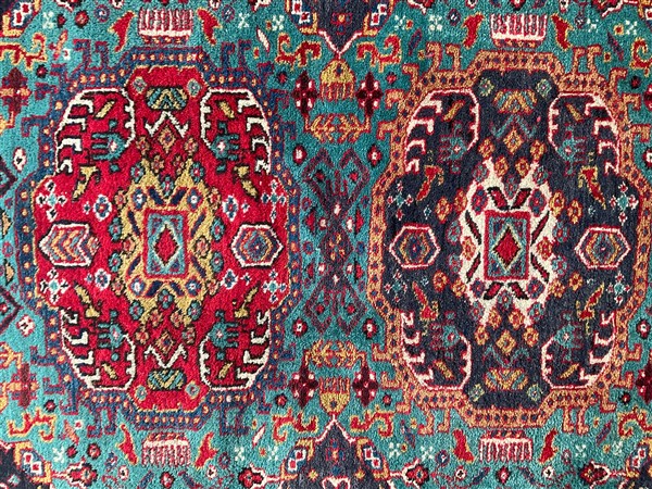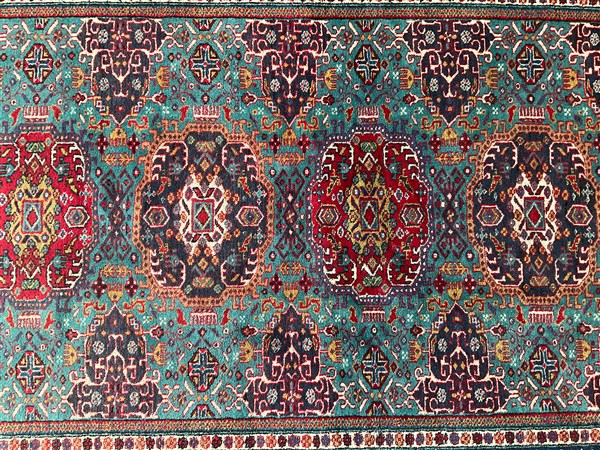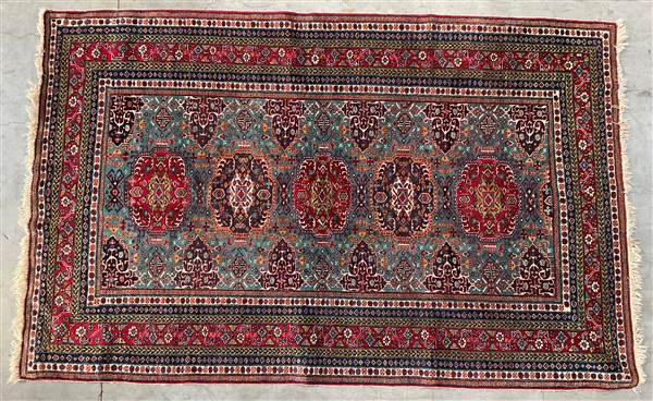 Tappeto caucasico di recente manifattura. Decoro con cinque medaglioni su campo azzurro (cm 265x165) (difetti)