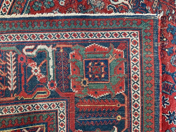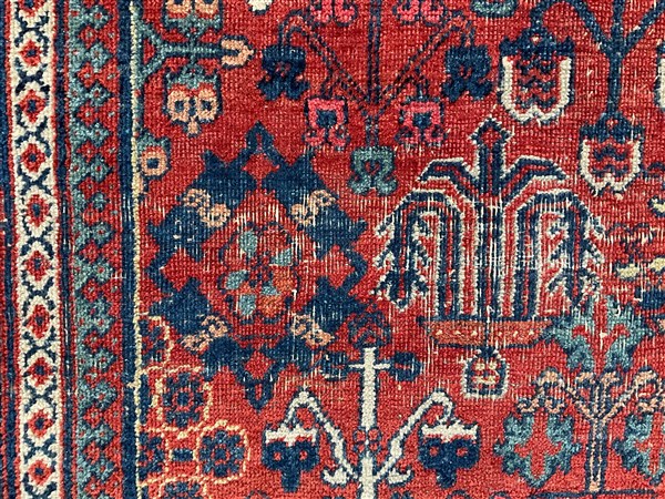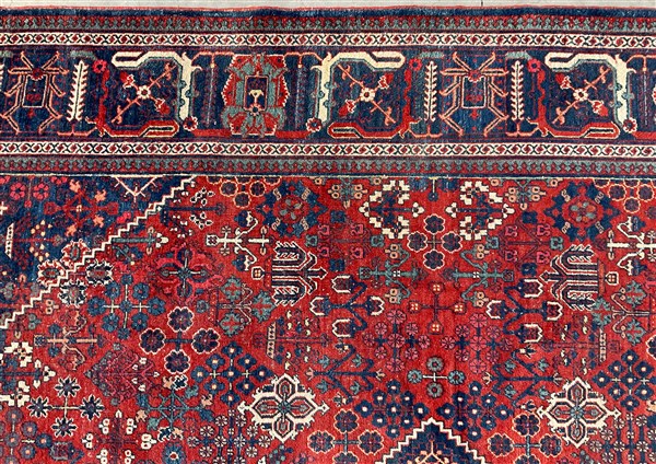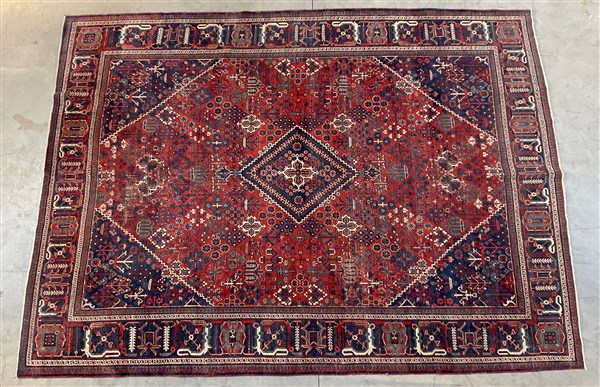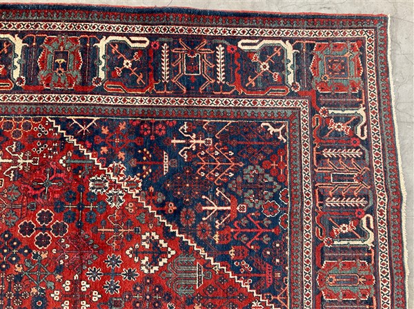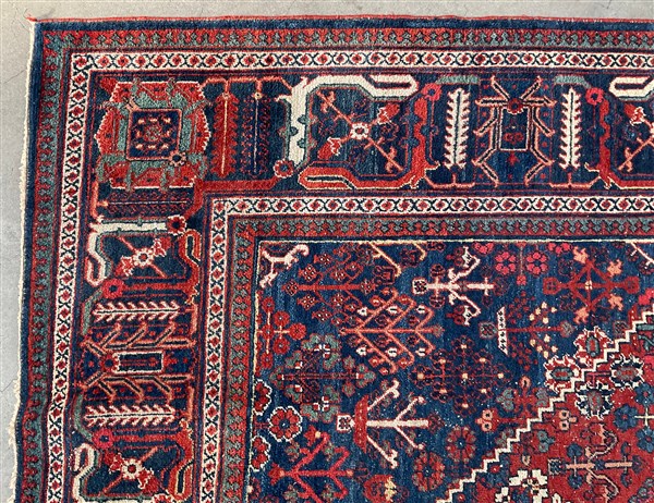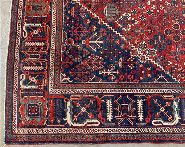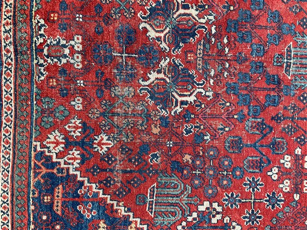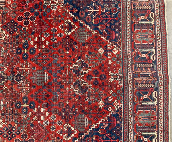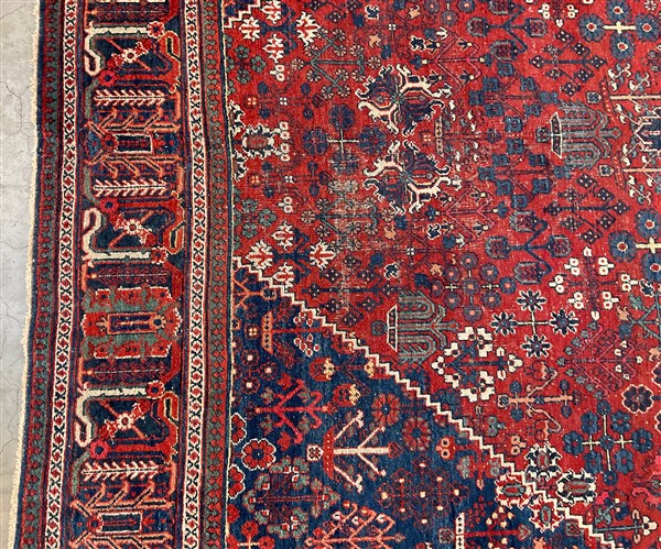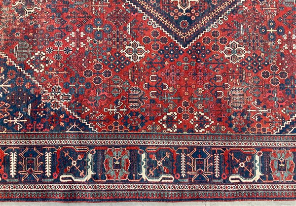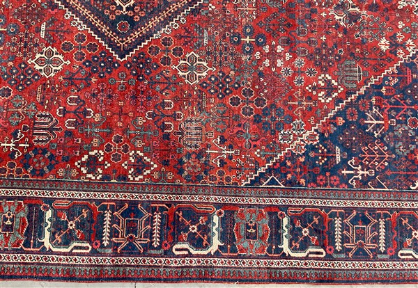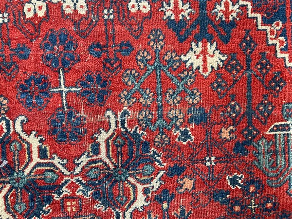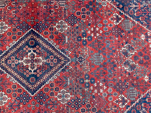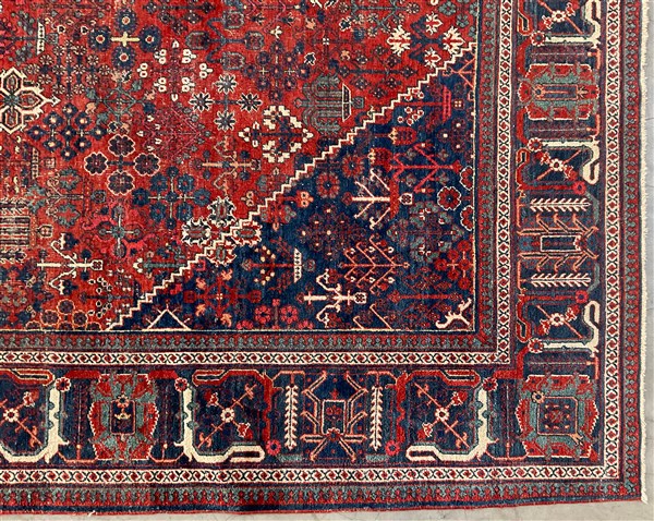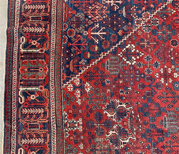 Tappeto Joshagan, Persia, secolo XX. Decoro con piccolo medaglione romboidale su campo rosso cosparso di motivi floreali e vegetali stilizzati a fondo blu. Angolari e bordura a fondo blu (cm 366x2679 (difetti e rapature)